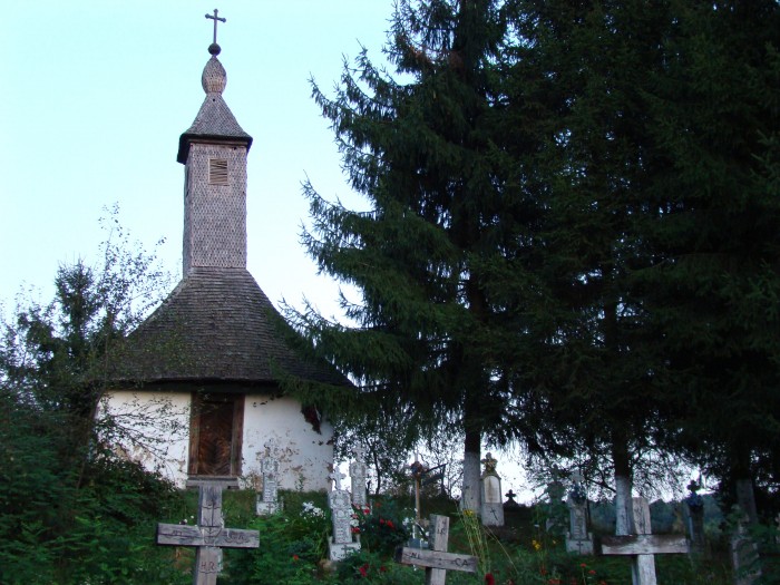Biserica din lemn se afla in mijlocul cimitirului si este construita din lemn de stejar imbinate cu colturi in coada de randunica, iar ultimele cununi de barne formeaza multiconsole.